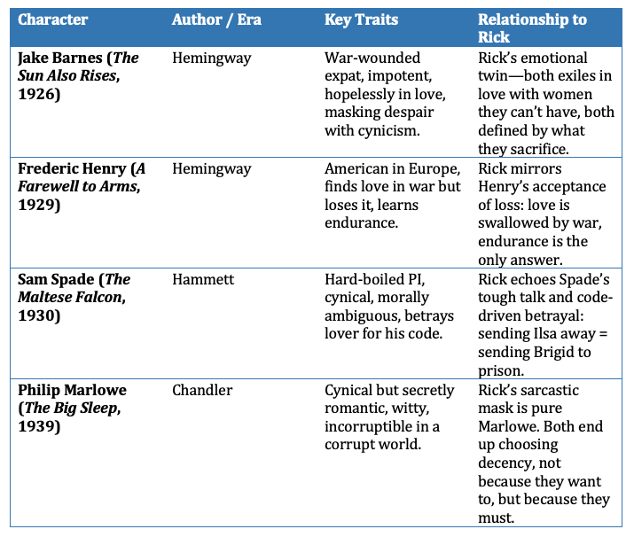 In other words, Rick is not just a character in Casablanca—he’s the culmination of two decades of literary and cultural archetypes converging on the big screen in 1942. To understand him, you need to see him as part Hemingway hero, part noir detective, and part reluctant Stoic sage.